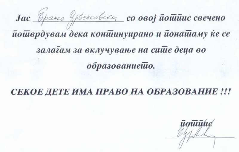 Исто така се потсети Претседателот дека минатата година потпиша гаранција со која се обврза дека ќе се залага за вклучување на сите деца во образованието.
