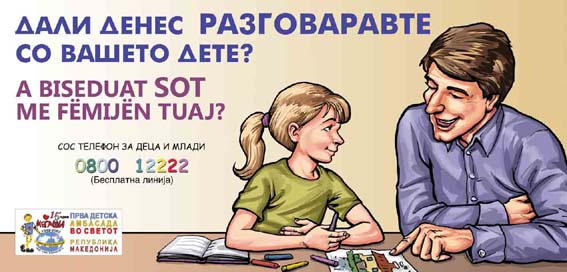 The Embassy “Megashi” through 42 billboards in the City of Skopje and 18 billboards in the other towns in Macedonia shall convey the message that we should pay more attention and devote more time to the children. Children need talk, they need to be asked how do they feel, how did they do at school, how did they do with their friends, how to manage all the educational programs and everything in the sphere of their needs and interests.
