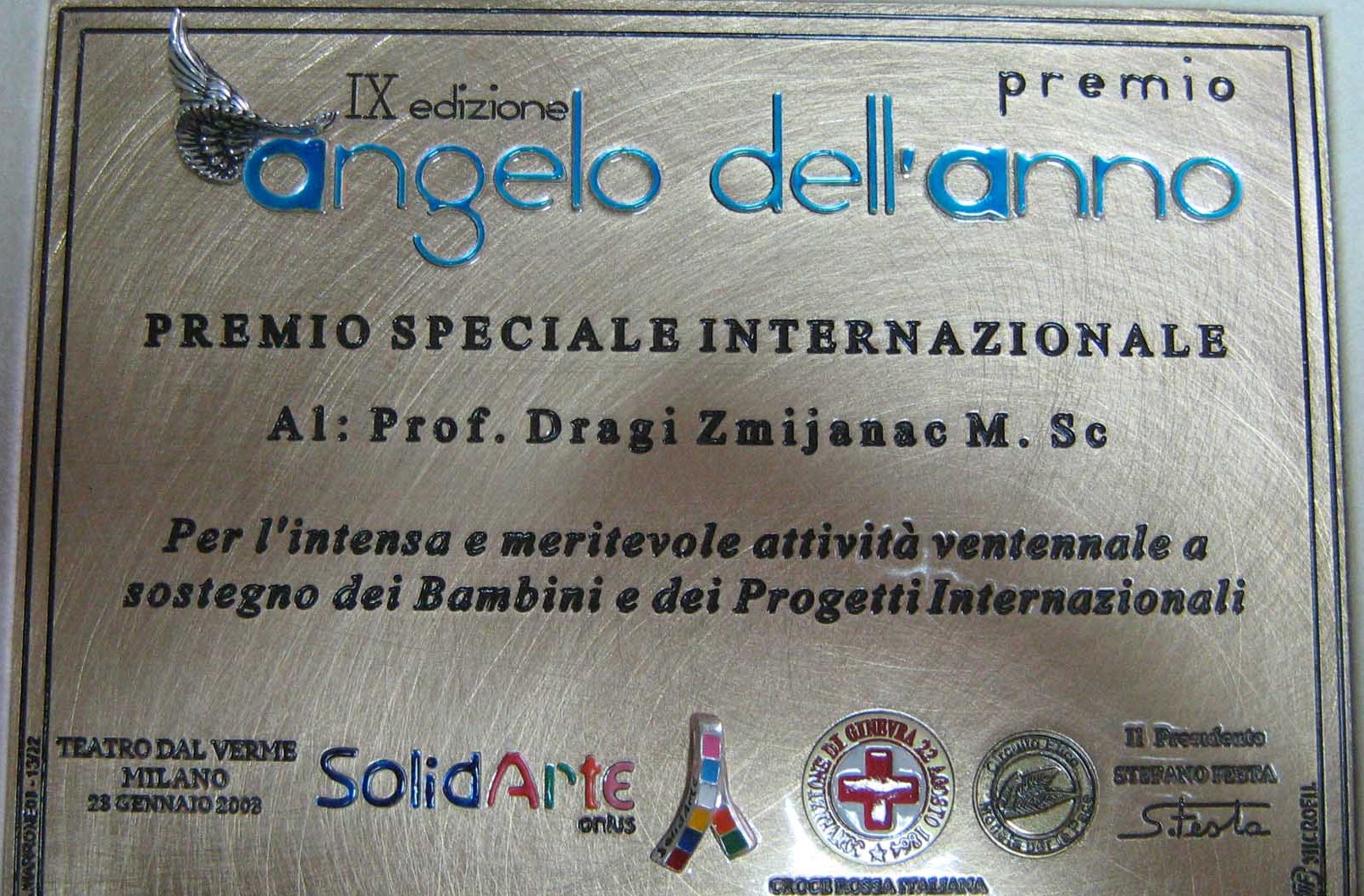 Angelo dell'anno The Ninth edition, Manifestation “Angel of the year” Milan, Theater “Dal Verme” 28th January 2008 Special International Award To Prof. Dragi Zmijanac MASC Founder and Executive Director of the First Children's Embassy in the World- Megjashi, Republic of Macedonia