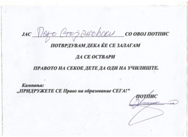 Kanë kaluar plot dy vjet, që kur Qeveria e Maqedonisë mori përsipër të realizojë planin aksionar për kyçjen e të gjithë fëmijëve në procesin edukativo arsimor dhe nuk është bërë thuajse asgjë në këtë drejtim. Kështu, konstaton njeriu i parë i Ambasadës së parë të fëmijëve “Megjashi”, në Shkup, Dragi Zmijanac, që të mërkurën me përfaqësues të ambasadës kanë rikujtuar ministrin e Arsimit dhe Shkencës, Pero Stojanovksin se “pikërisht në këtë vend, para dy viteve, kyeministri dhe ministri i atëhershëm i Arsimit nënshkruan dokumentin me të cili garantonin se do të angazhohen që të gjithë fëmijët të ky;en në procesin mësimor”, tha Zmijanac. Të mërkurën, një grup fëmijësh nga të gjitha qytete e Maqedonisë, u tubuan në sheshin kryesor të Shkupit për t’ju bashkangjitur kampanjës botërore “Arsim për të gjithë”.