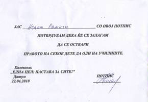 На средбата, Заменикот Министер потпиша гаранција со која се обврза во текот на неговиот мандат да направи сe што е во негова можност за вклучување на сите деца во образовниот систем и за намалување на неписменоста во Република Македонија.