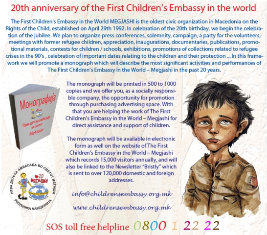 The First Children's Embassy in the World MEGJASHI is the oldest civic organization in Macedonia on the Rights of the Child, established on April 29th 1992. In celebration of the 20th birthday, we begin the celebration of the jubilee. We plan to organize press conferences, solemnity, campaign, a party for the volunteers, meetings with former refugee children, appreciation, inaugurations, documentaries, publications, promotional materials, contests for children / schools, exhibitions, promotions of collections related to refugee crises in the 90’s , celebration of important dates relating to the children and their protection ... In this framework we will promote a monograph which will describe the most significant activities and performances of The First Children’s Embassy in the World – Megjashi in the past 20 years.