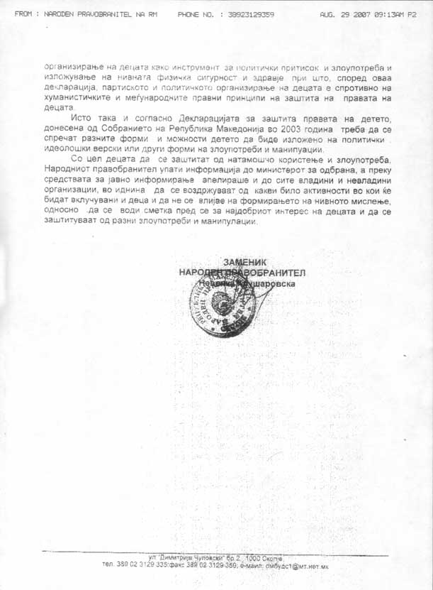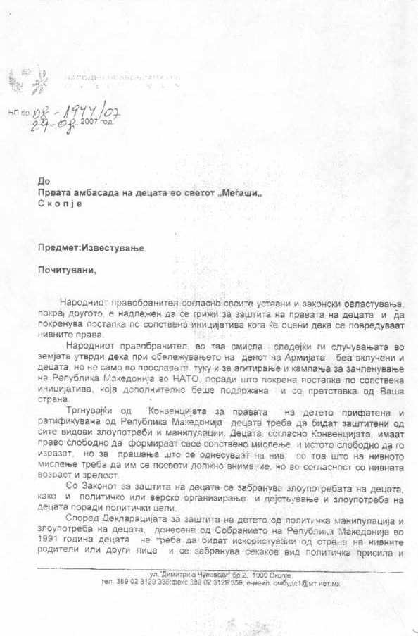 Првата детска амбасада во светот - Меѓаши доби одговор од Народниот Правобранител на претставката за политичка злоупотреба на деца