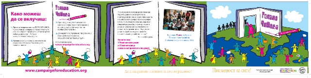 Ни претставува особено задоволство да Ве известиме дека и оваа година се одржа Глобалната кампања за вклучување на децата во образование. Кампањата е меѓународна и на светско ниво е координирана од старана на Global March Against Child Labour. На национално ниво кампањата ја координира и ја организира Првата детска амбасада во светот- Меѓаши. Во нашата држава секојдневно се среќаваме со деца, кои на различни начини се лишени од нивното основно право: право на образование. Главна цел на оваа кампања е вклучување на сите деца во образование и овозможување писменост за сите.