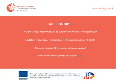 Ни претставува задоволство да Ве поканиме на локалните панели во Дебар, Кисела Вода, Гостивар, Велес и Виница во рамки на проектот „Место за растење: Општини посветени на децата“.