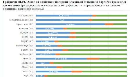 Освен Црвен крст, кого го познаваат големо мнозинство граѓани и Мост, Меѓаши, СОС Детско село, ЗНМ и ХКЧП, кои ги познаваат мнозинство граѓани, останатите организации ги познаваат помалку од половината граѓани.
