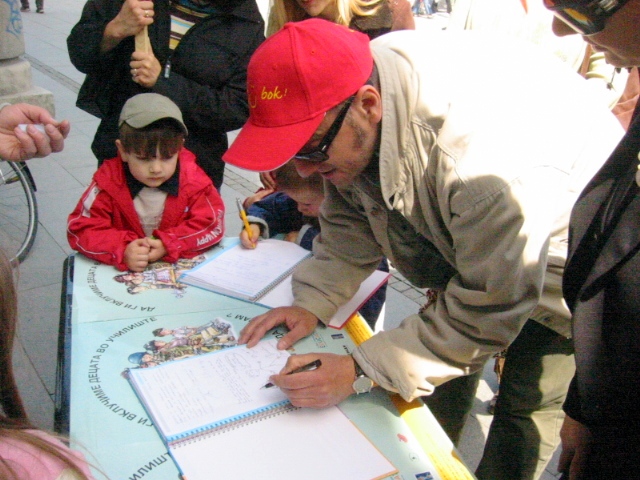 Our celebrity, Vlatko Stefanovski participated in the Global Action Week 2008 On the occasion of the World’s Biggest School Lesson, the worldly famous macedonian musician Vlatko Stefanovski was guest in the first grade class in the Primary School “Jan Amos Komenski”, Skopje. Every child wanted to ask Vlatko a question. They were mostly concerned about the problem with the children’s illiteration, so they were asking: