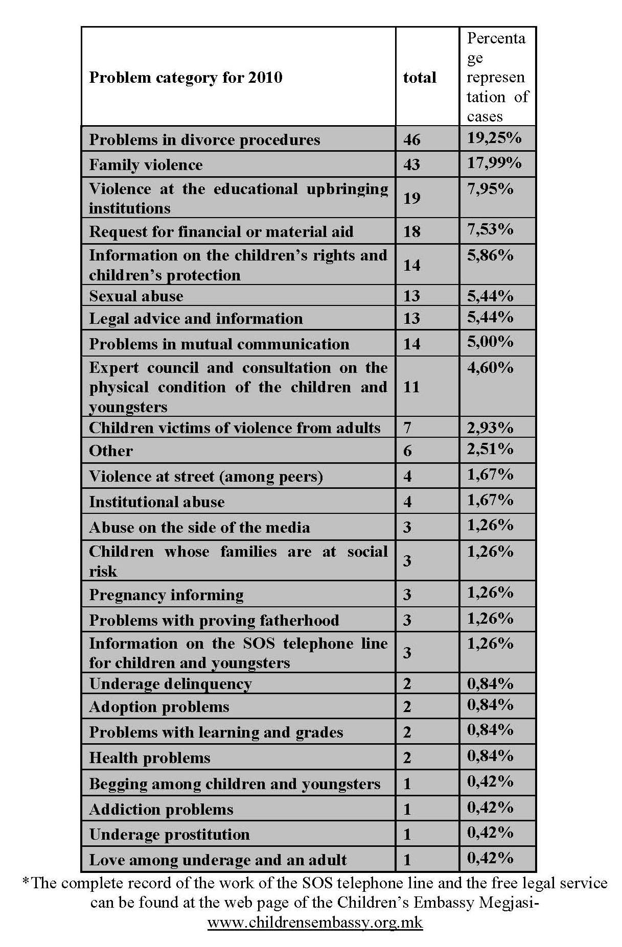 *The complete record of the work of the SOS telephone line and the free legal service can be found at the web page of the Children’s Embassy Megjasi-www.childrensembassy.org.mk