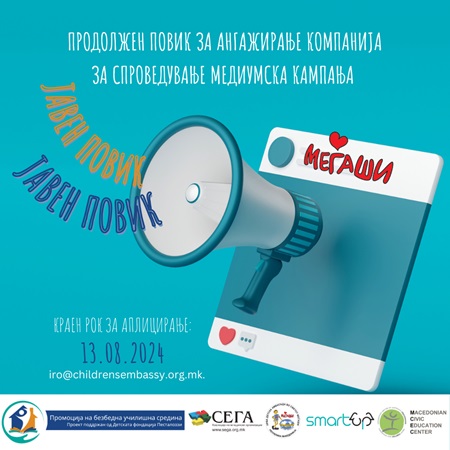 Првата детска амбасада во светот МЕЃАШИ во рамки на проектот „Промоција на безбедна училишна средина“ објавува повик за ангажирање медиумска/маркетинг агенција која ќе биде одговорна за креирање и спроведување кампања што ќе ја промовира важноста на родителите во намалувањето на насилството врз/меѓу децата и младите и ќе влијае на создавање безбедна средина во училиштата.