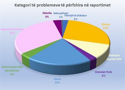 Për 223 fëmijë ekziston shkelje e mundshme e një ose më shumë të drejtave të fëmijëve. Shkeljet më të shpeshta i referohen kategorisë së marrëdhënieve familjare (shkelja e të drejtës së fëmijës për t’u takuar me njërin prind gjatë procedurave të divorcit dhe mosrespektimi i vendimeve të qendrave për punë sociale), e pastaj menjëherë janë raportimet për shkelje të të drejtave të fëmijës gjatë dhunës (dhunë bashkëmoshatarësh (buling), dhunë fizike, dhunë mendore/emocionale, neglizhencë (moskujdes), dhunë seksuale). Në vendin e tretë për nga shpeshtia është shkelja e të drejtës së qasjes në institucione, shërbimet sociale, shëndetësore dhe shërbime të tjera, pastaj problemet lidhur me shëndetin mendor, shkollën dhe shëndetin fizik. Në shumicën e raporteve, problemi i raportuar është kompleks dhe mund të regjistrohet në disa kategori, kështu që numri i fëmijëve të prekur sipas kategorisë së problemit është më i madh se numri i fëmijëve të përfshirë të cilëve u referohen raportimet, sepse një fëmijë numërohet më shumë se një, përkatësisht nga numri i kategorive në të cilat është regjistruar problemi.