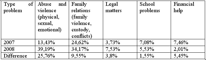 Comparing with 2007, during 2008 the percent of calls regarding the abuse and violence upon children has been increased (for 25,76%) family relations (FOR 9, 55%), question regarding legal matters (for 3,8%) and others.